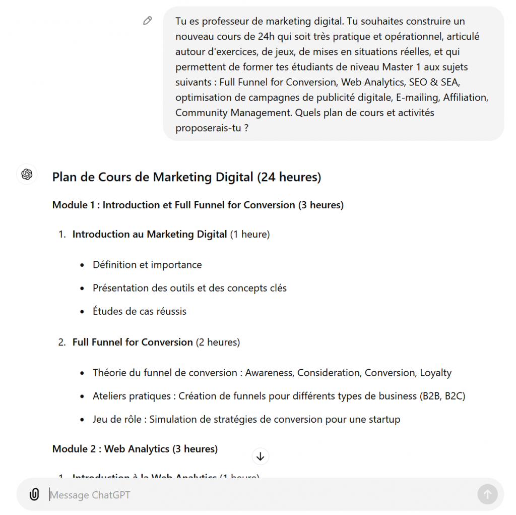 Pour développer le syllabus de votre cours, vous pouvez aussi demander de l’aide à des outils d’intelligence artificielle générative (Perplexity, ChatGPT…).